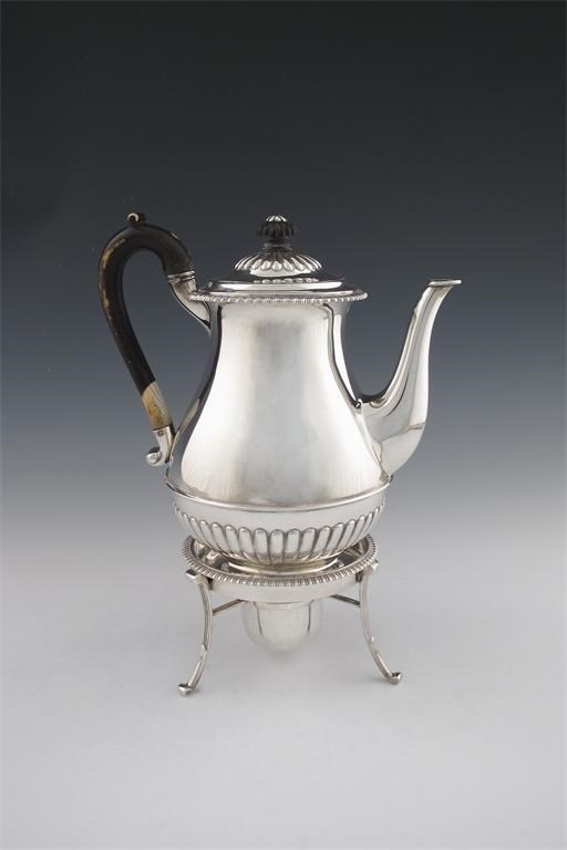 A George IV silver coffee pot on an associated silver stand and burner, by Robert Garrard, London 1826, the stand and burner by Michael Starkey, London 1819, baluster form, part fluted decoration, gadroon border, scroll handle, repaired foot, the stand of circular form, on three scroll legs, height 28cm, approx. weight 36oz.