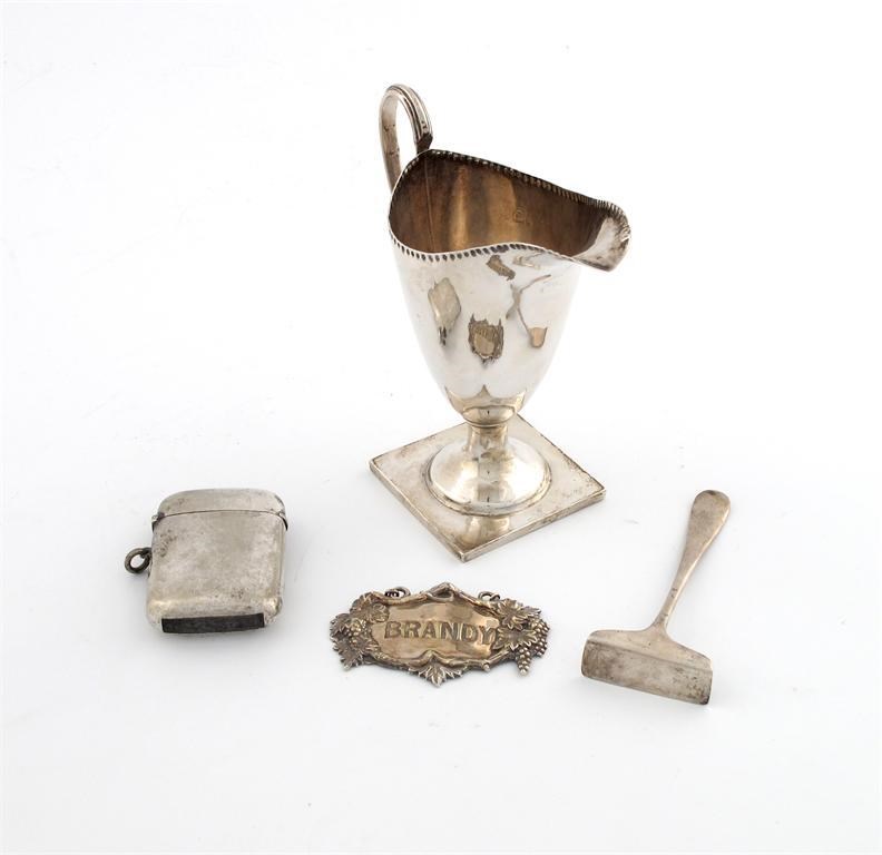 comprising silver items: a late-Victorian silver helmet cream jug, punch bead border, Birmingham 1892, a baby pusher and electroplated items: a vesta case and a wine label, approx. weighable 2oz. (4)