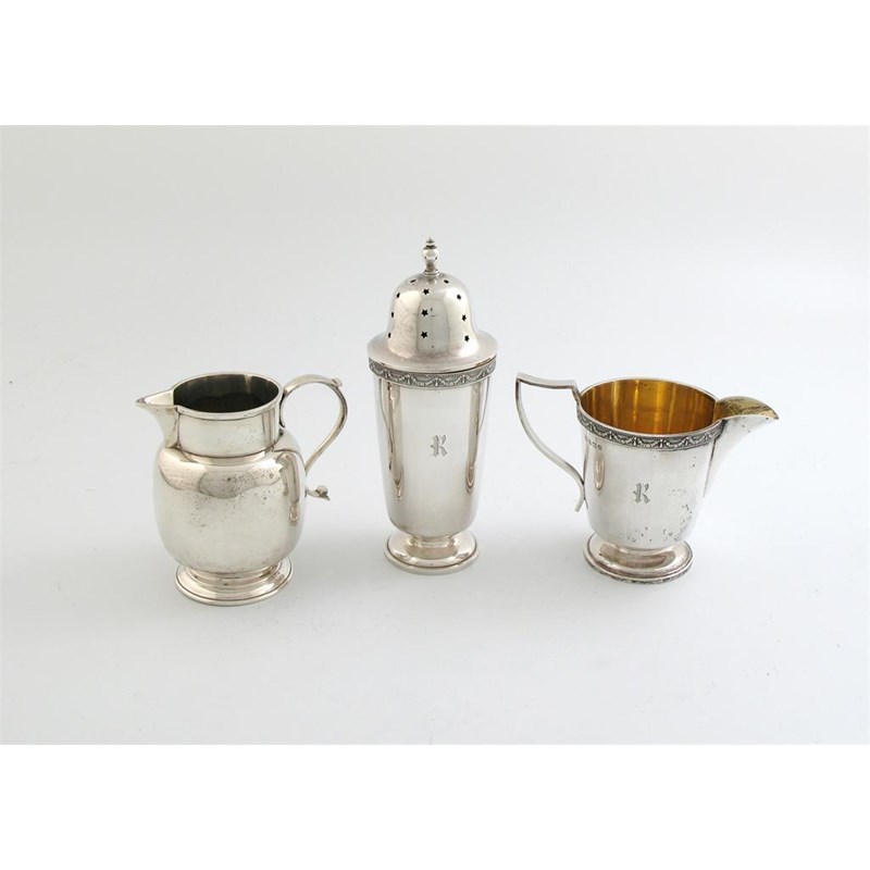 comprising: a cream jug and sugar caster, by A and J Zimmerman, Birmingham 1927, tapering circular form, swag border, plus a cream jug of circular bellied form, approx. weight 15oz. (3)