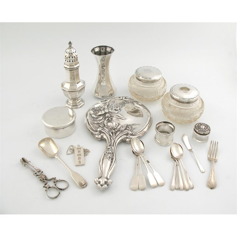 comprising: a sugar caster of octagonal baluster form, a faceted baluster vase, a hand mirror, a circular box, two silver-mounted cut glass toilet jars, a small toilet jar, a napkin ring, a pendant, a pair of 18th century sugar tongs, and small items of flatware, approx. weighable 20oz. (qty)