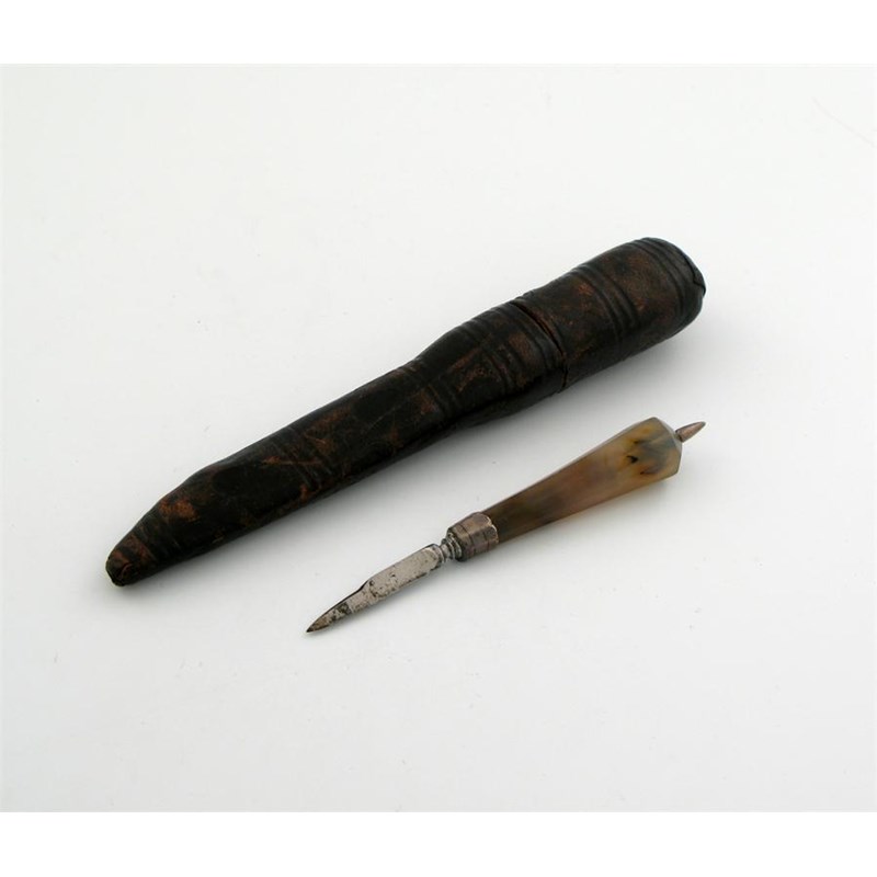 tapering faceted cannon shaped agate handle, small sharp blade, in a fitted leather case, length 11.2cm.