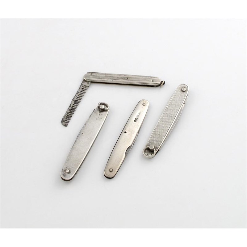 reeded casing, steel comb, plus three silver cased penknives. (4)