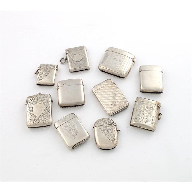 comprising: four with engraved foliate decoration, three of plain form, and three with engine-turned decoration, approx. weight 8oz. (10)