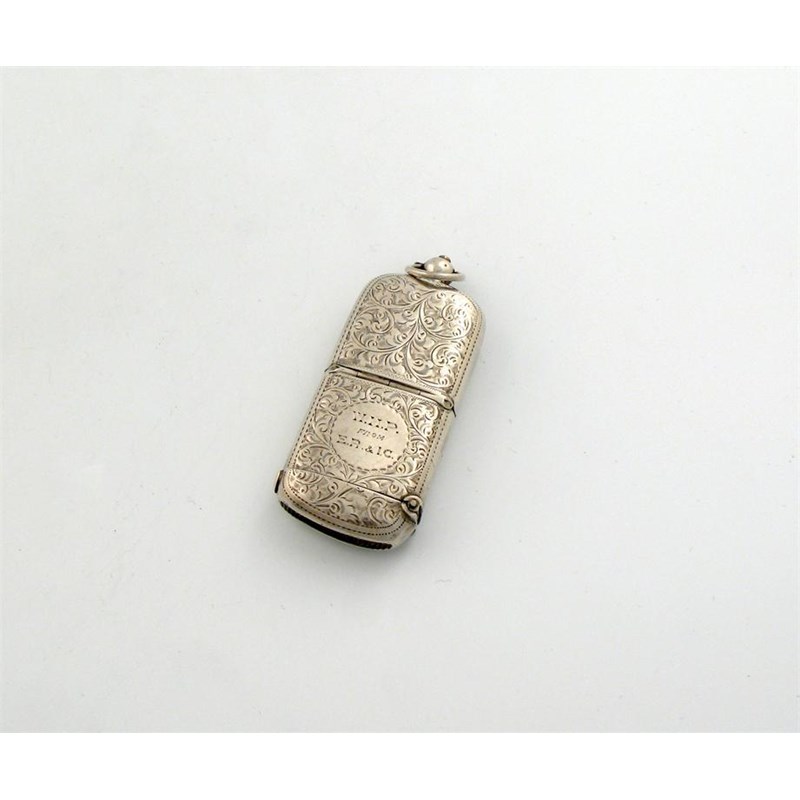 rounded rectangular form, engraved foliate scroll decoration, inscribed, with a ring attachment, length 7.3cm, approx. weight 1.1oz.