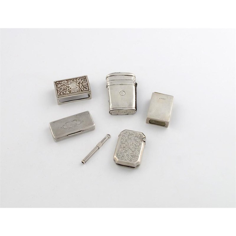 comprising: a William IV etui case with a later striker attachment, London 1835, a lighter with engraved foliate decoration, two match box covers, a toothpick and an unmarked continental silver snuff box. (6)