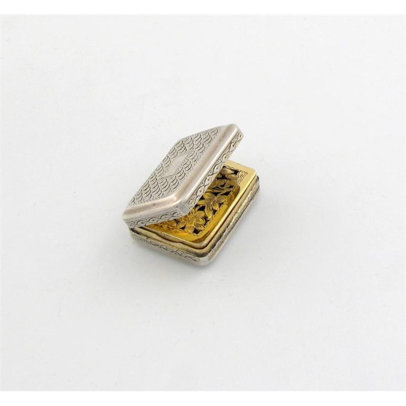 rectangular form, engraved decoration, the interior with a pierced foliate silver=gilt grille, length 3.6cm, approx. weight 0.7oz.