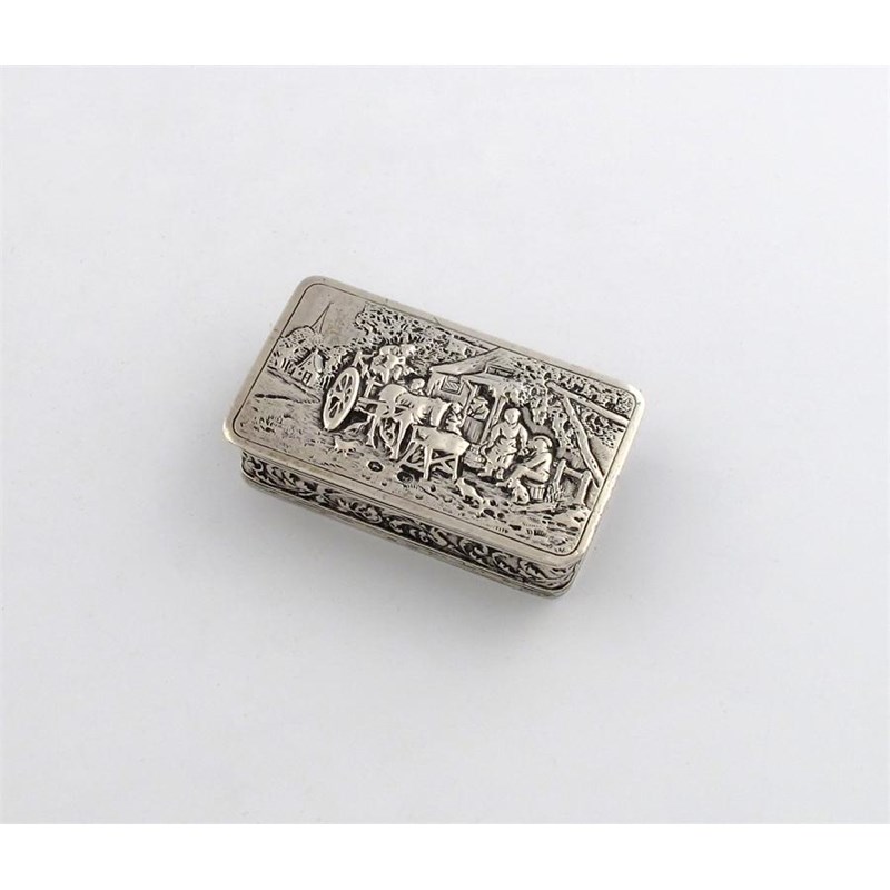 rectangular form, embossed with a figural scene, the sides with foliate scroll decoration, length 7.8cm, approx. weight 2.5oz.