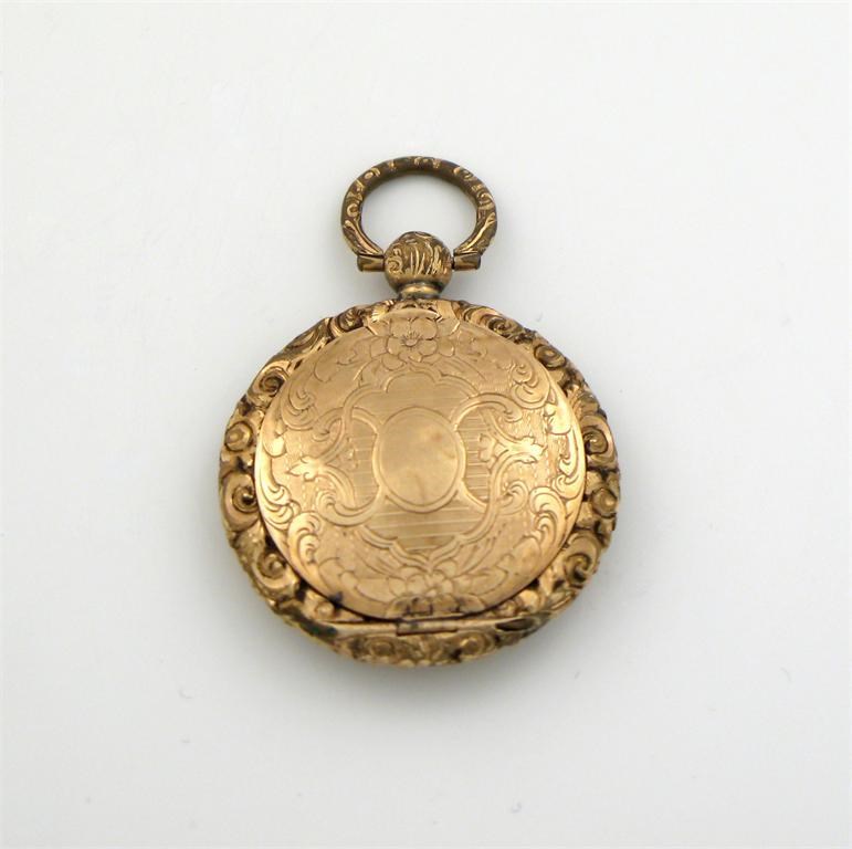 of circular watch case form, foliate scroll border, pierced foliate grille, with a loop attachment, diameter 3.2cm.