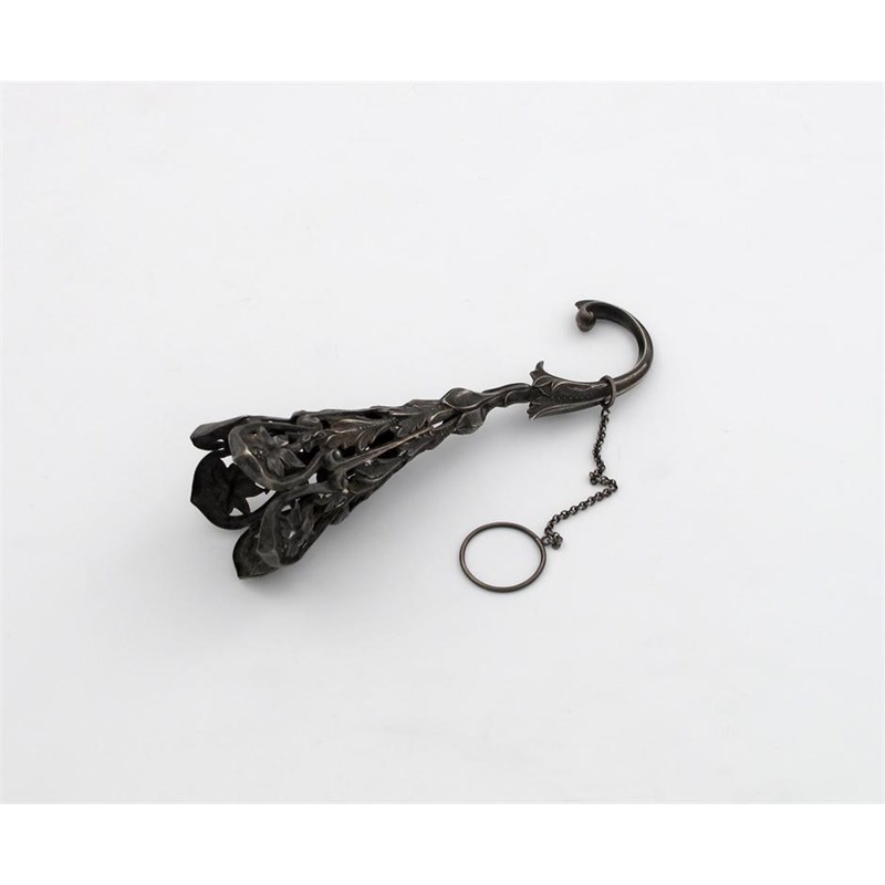 tapering circular form, pierced and embossed foliate decoration, scroll carrying handle with a chain and finger ring, length 12.2cm, approx. weight 0.6oz.