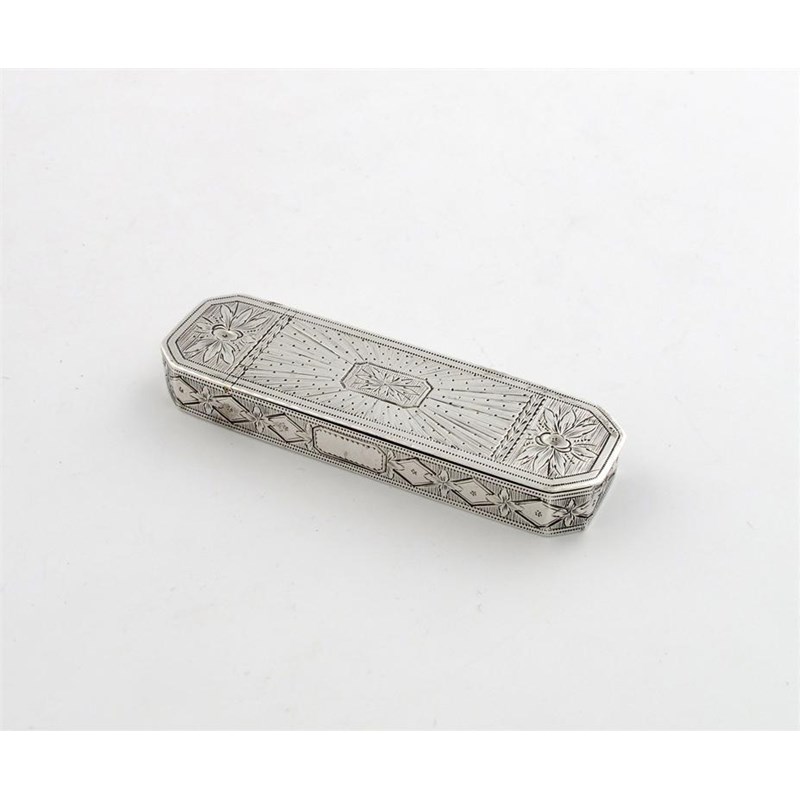 rectangular form, canted corners, bright-cut engraved foliate and radiating decoration, flush hinged cover, the interior fitted with a mirror and velvet lined, length 7.9cm, approx. total weight 1oz.