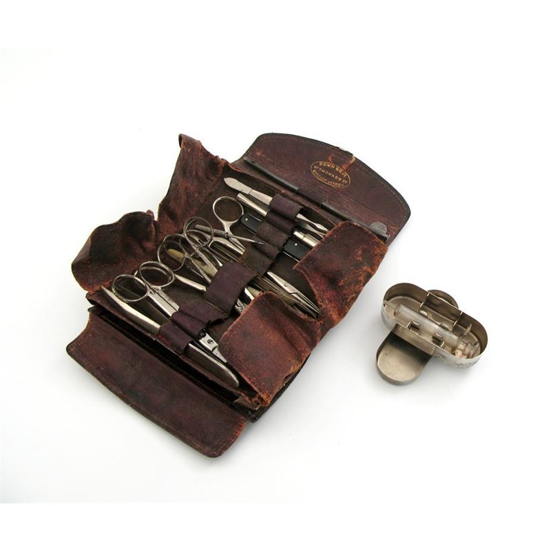 comprising a silver catheter, London 1915, and various other tools, plus a cased syringe. (2)