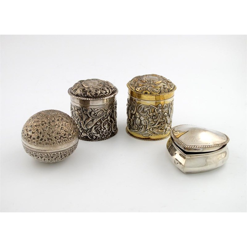 comprising: two dressing table canisters, one silver-gilt, both with embossed foliate scroll and bird decoration, London 1891 and 1897, plus a trinket box of heart shape, Birmingham 1895, and an Indian box with chased foliate scroll decoration, approx. weight 17oz. (4)