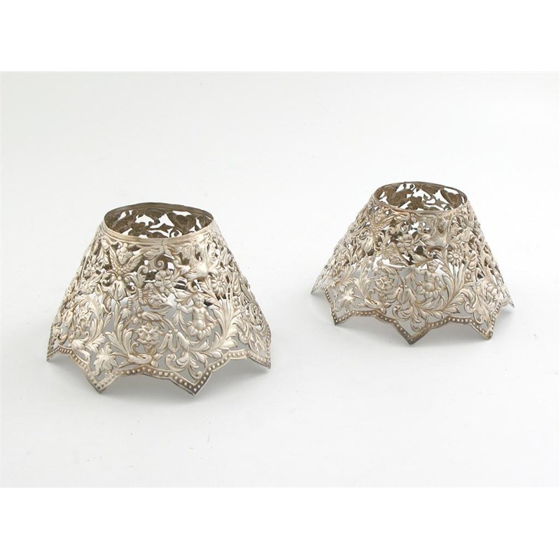 tapering circular form, pierced and embossed with figures within foliate scroll decoration, heigth 7.3cm, approx. weight 2.9oz. (2)