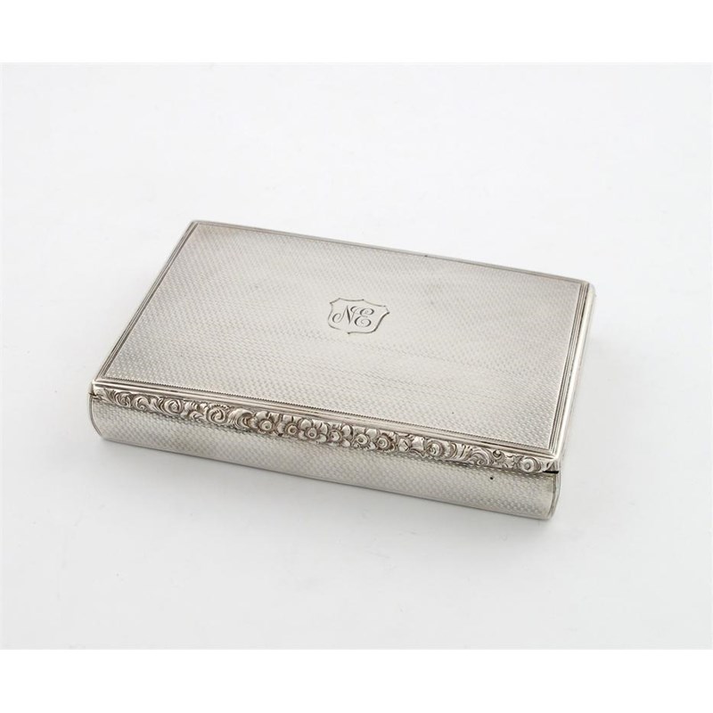 rectangular form, engine-turned decoration, the hinged cover with an initialled cartouche and foliate thumb-piece, length 13cm, approx. weight 8.5oz.