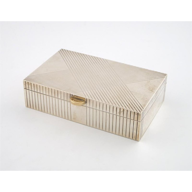 rectangular form, with patterned fluted decoration, yellow thumb-piece, the interior inscribed, length 16.5cm.