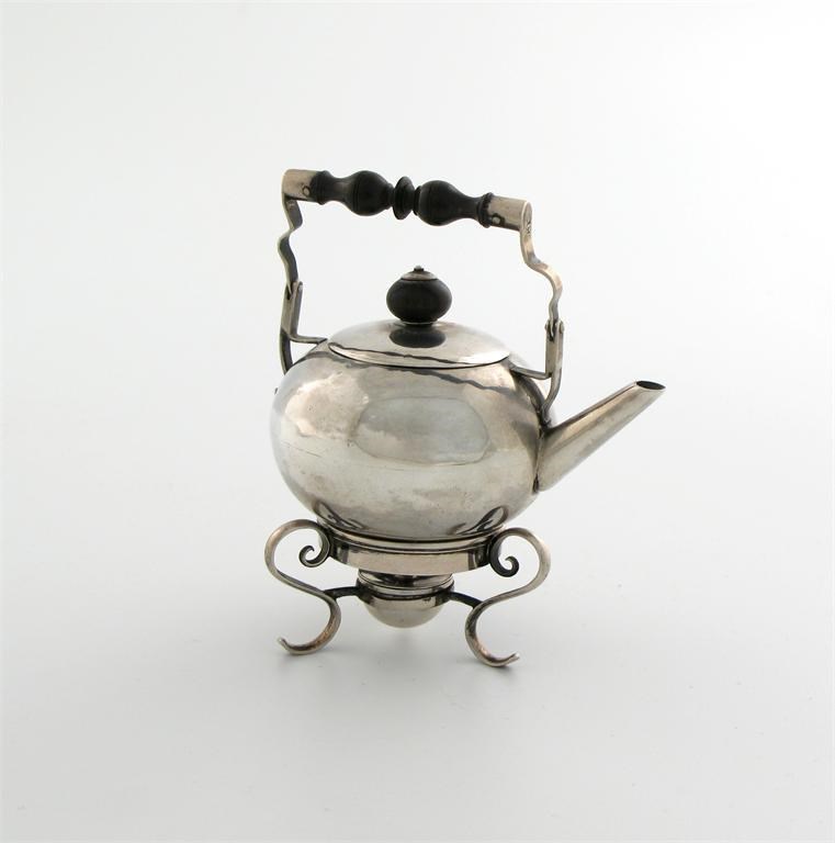 circular form, hinged turned wooden baluster carrying handle, pull-off cover with a knop finial, the stand of circular form, on three scroll legs with a burner, height 8.5cm, approx. weight 1.7oz. (2)