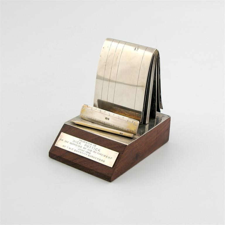 modelled as a note book, pencil and ruler, on a wooden plinth, with a presentation plaque inscribed, 'Presented to Dick Puttick on the occasion of his retirement June 1985, by T.W.C Quantity Surveyors', height 10cm.