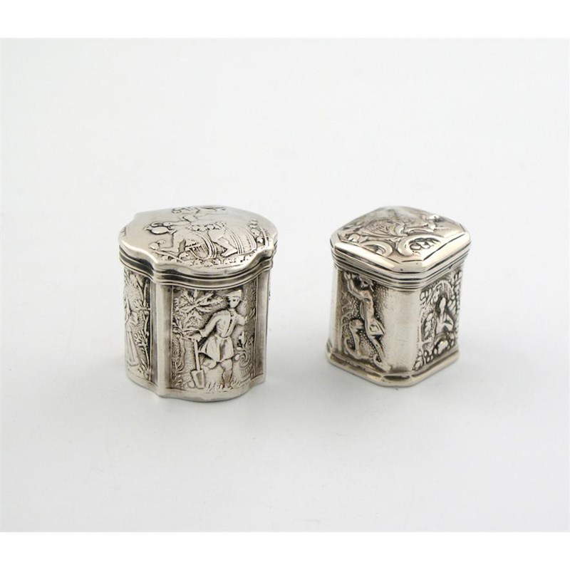 square form, canted corners, embossed with figural panels, height 3cm, plus another late 18th century Dutch box, marks worn, approx. total weight 0.9oz. (2)