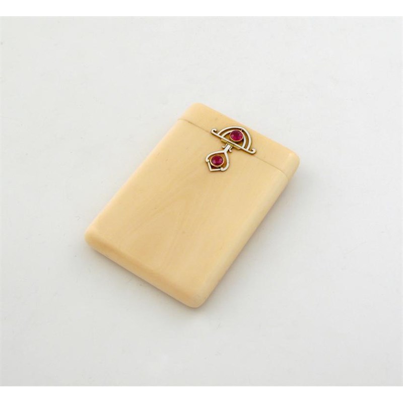 rectangular form, the clasp and hinges with white enamel decoration and set with rubies, length 8.7cm.