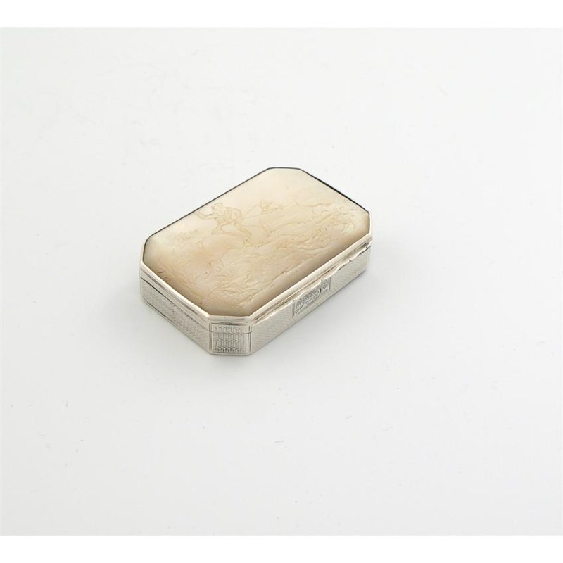 rectangular form, canted corners, the hinged cover engraved with a hunting scene of a huntsman and his hounds, the base engraved with a running fox, the sides with engine turned decoration and inscribed 'Richd Tookey', length 7.5cm.