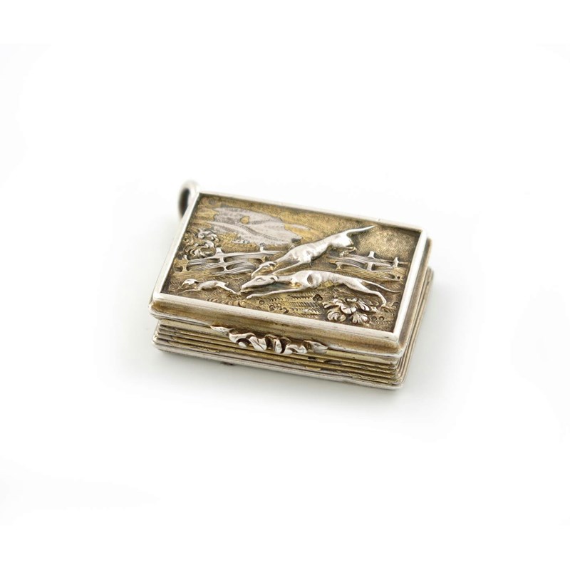 rectangular form, the hinged cover with a coursing scene, reeded sides and engine-turned base, with a later ring attachment, length 3.7cm, approx. weight 0.9oz.