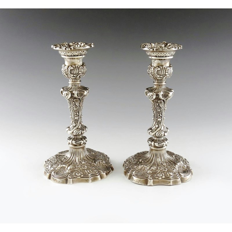 in the Rococo manner, foliate scroll decoration, detachable drip pans, on raised shaped circular bases, (some holes), engraved with a crest, height 28.8cm. (2)