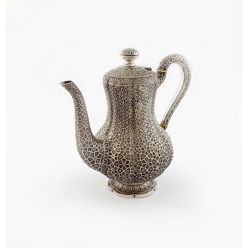 by Hunt and Roskell, London 1874, also stamped 'HUNT AND ROSKELL, LATE STORR AND MORTIMER', lobed baluster form, scroll handle with ivory insulators, domed hinged cover with a knop finial, decorated in the Orientalist style with chased foliate motifs on a matted background, on a shaped circular foot, height 21cm, approx. weight 25oz.