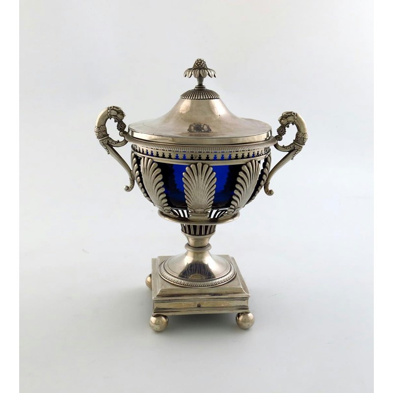 circular form, with fluted palm supports, lion head scroll handles, the pull-off cover with a pierced finial, on a raised square base on four ball feet, with a later blue glass liner, height 25cm, approx. weight 16.5oz.