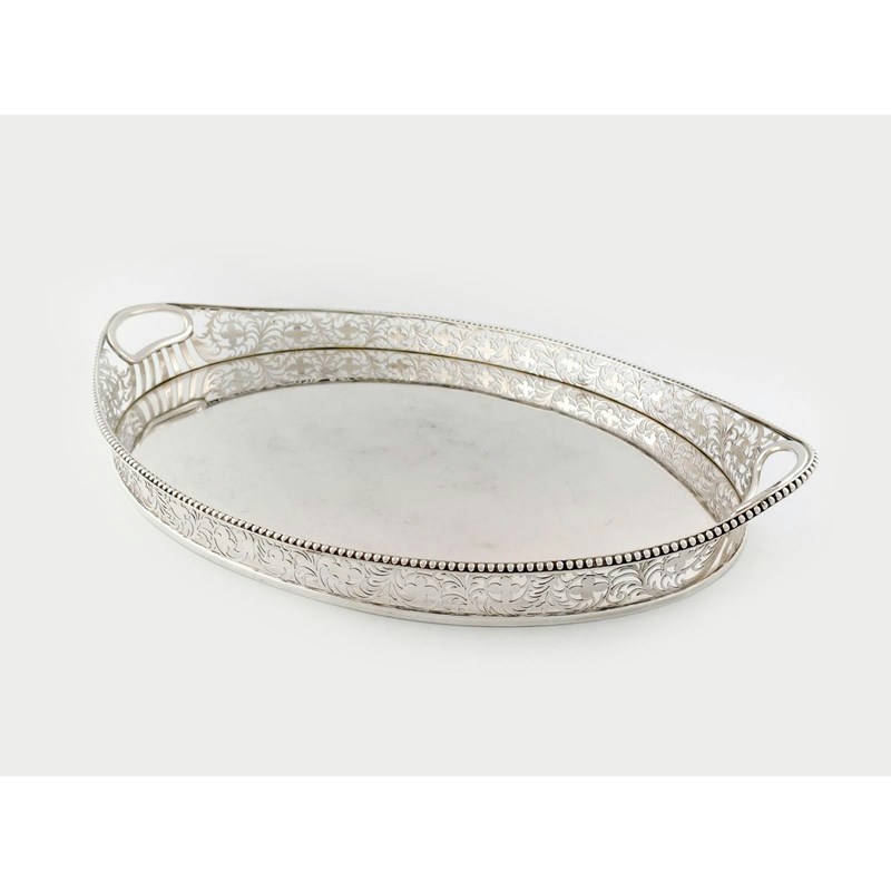oval form, the gallery with inset handles and with pierced foliate scroll decoration, beaded border, length 61.5cm, approx. weight 96oz.