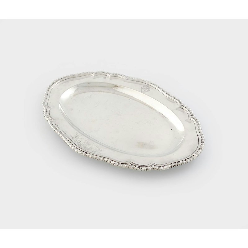 shaped oval form, gadroon border, engraved with an armorial and crest, length 30.8cm, approx. weight 17oz.