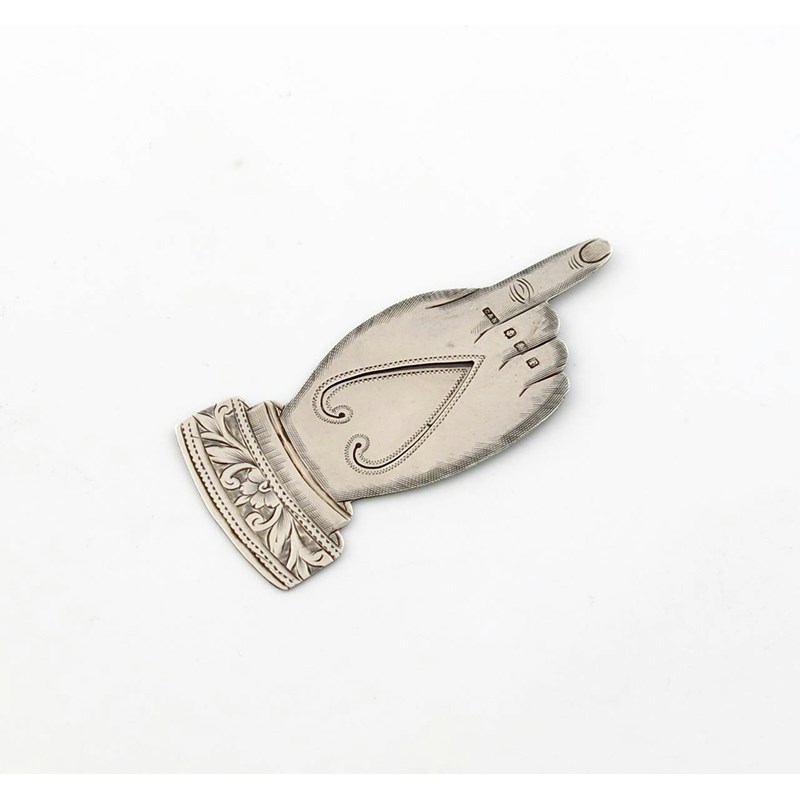 modelled as a hand, with the index finger raised, engraved decoration, length 6.8cm, approx. weight 0.2oz.