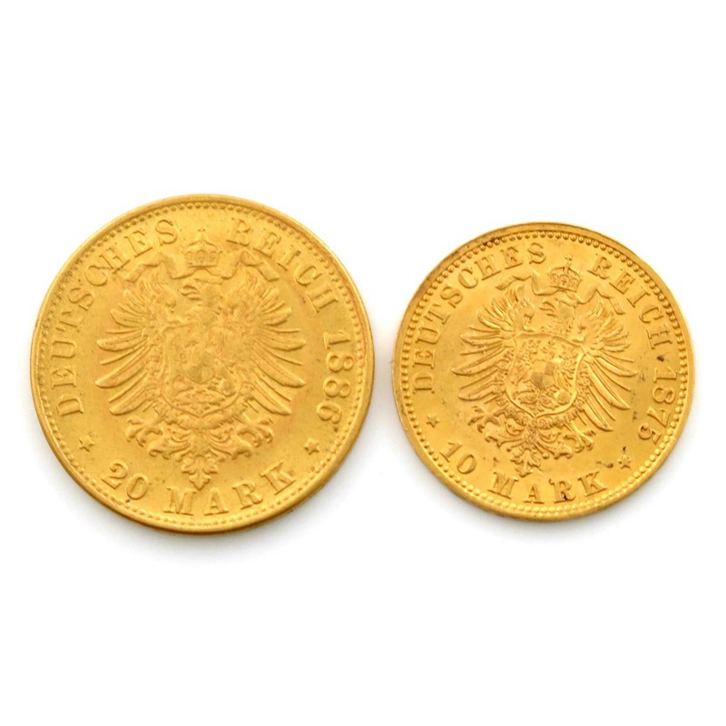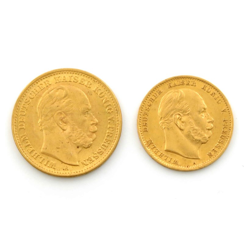 Germany, Empire, Prussia, Wilhelm I, 20-Marks, 1886 A, 10-Marks, 1875 A (F 3816, 3822). Good very fine. (2)