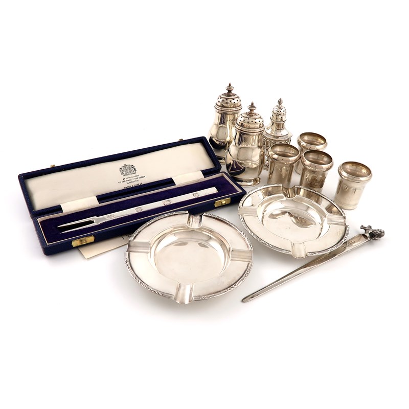 comprising: a pair of pepper pots, London 1924, oval baluster form, a matched pair of ashtrays, London 1912 and Birmingham 1919, a paper knife with a lion finial, a pepper pot, a cased pickle fork, and four German tot glass holders, no glass liners, approx. weight 17.5oz. (qty)