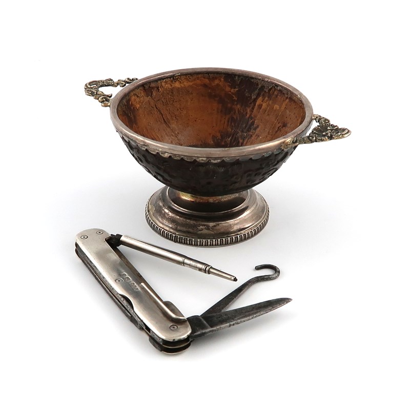 rounded rectangular form, with a pencil, knife, spike, nail file and button hook, length 7.5cm, plus an unmarked metalware mounted carved coconut bowl, with gilded pierced side handles. (2)