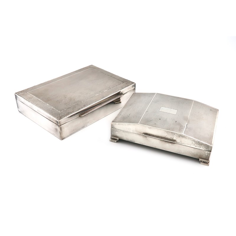 rectangular form, slanted cover with engine-turned decoration, with a vacant cartouche, on four bracket feet, plus a German silver cigarette box, of rectangular form, engine-turned decoration. (2)