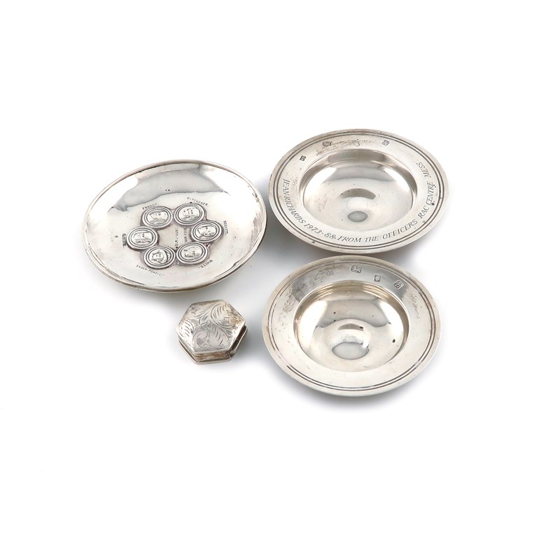 comprising: a late-Victorian silver dish, by Brewis & Co, London 1899, circular form, the centre inscribed 'Boer War 1899-1900', and with six medallions of Kitchener, Roberts, White, Baden-Powell, Buller and French, diameter 9.5cm, plus two Armada dishes and a modern pill box, approx. weight 5.6oz. (4)