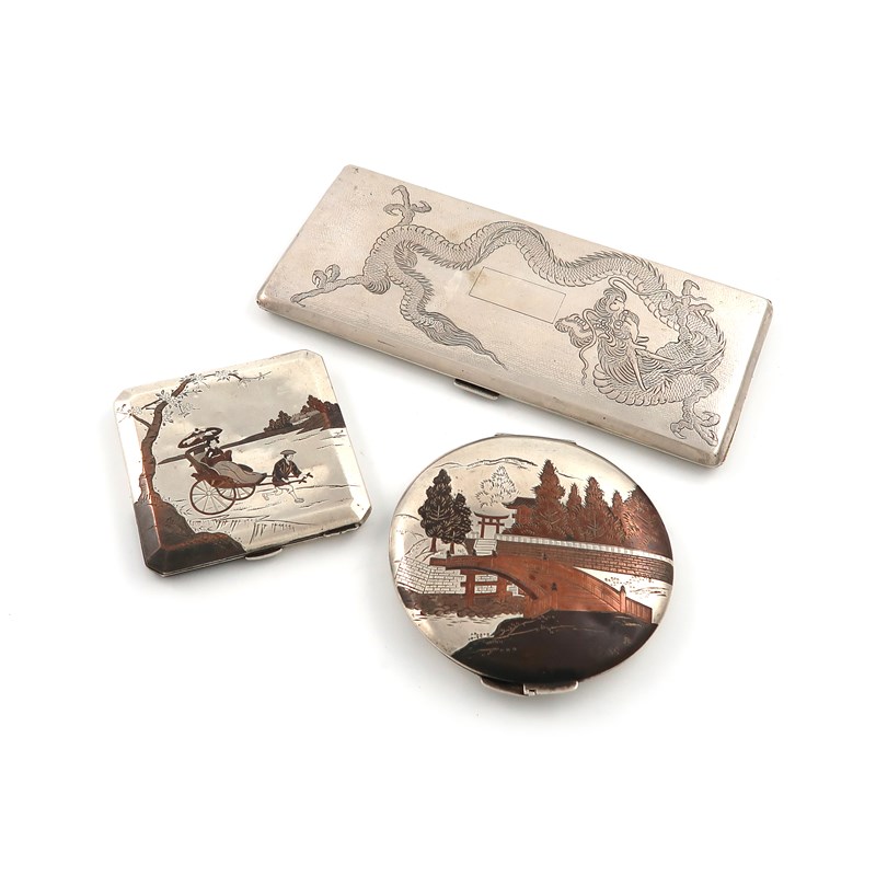 the cigarette case of rectangular form, with a scene of a lady being carried in a rickshaw, the circular compact with a bridge and landscape scene, plus a Japanese silver cigarette case of rectangular form, chased with a dragon on a matted background, approx. total weight 13.9oz. (3)