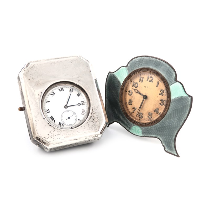 arched rectangular form, gilt-metal back and easel strut, length 9.7cm, plus a silver travelling watch case and pocket watch, the case London 1919, inscribed. (2)