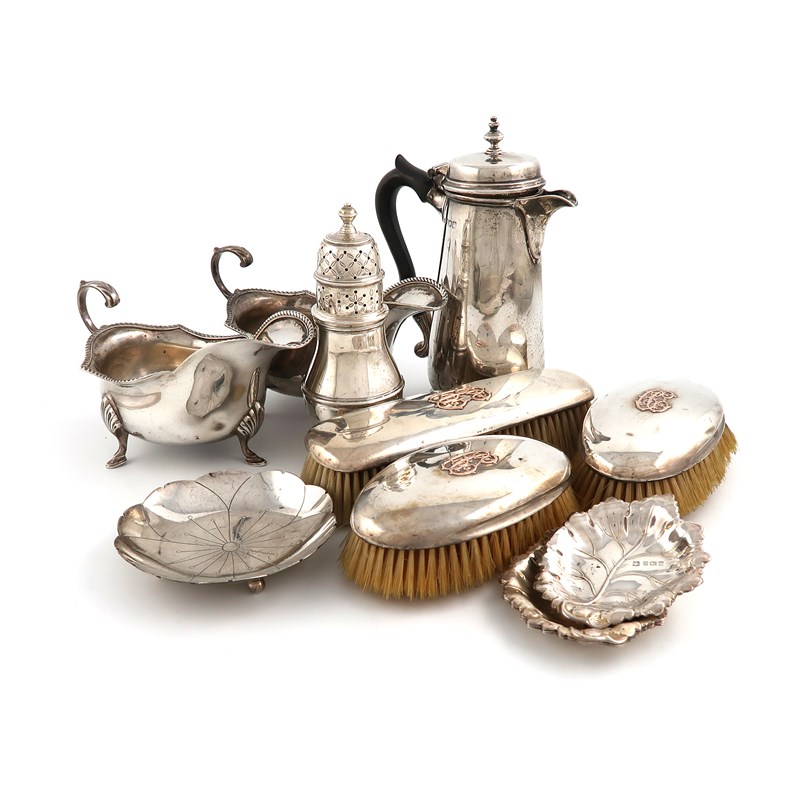comprising: a hot water pot, by the Barnards, London 1906, tapering circular form, a pair of oval sauce boats, Birmingham 1901, a set of four modern shell dishes, a dish, a sugar caster, London 1966, and three brushes, approx. weighable 34.5oz. (qty)