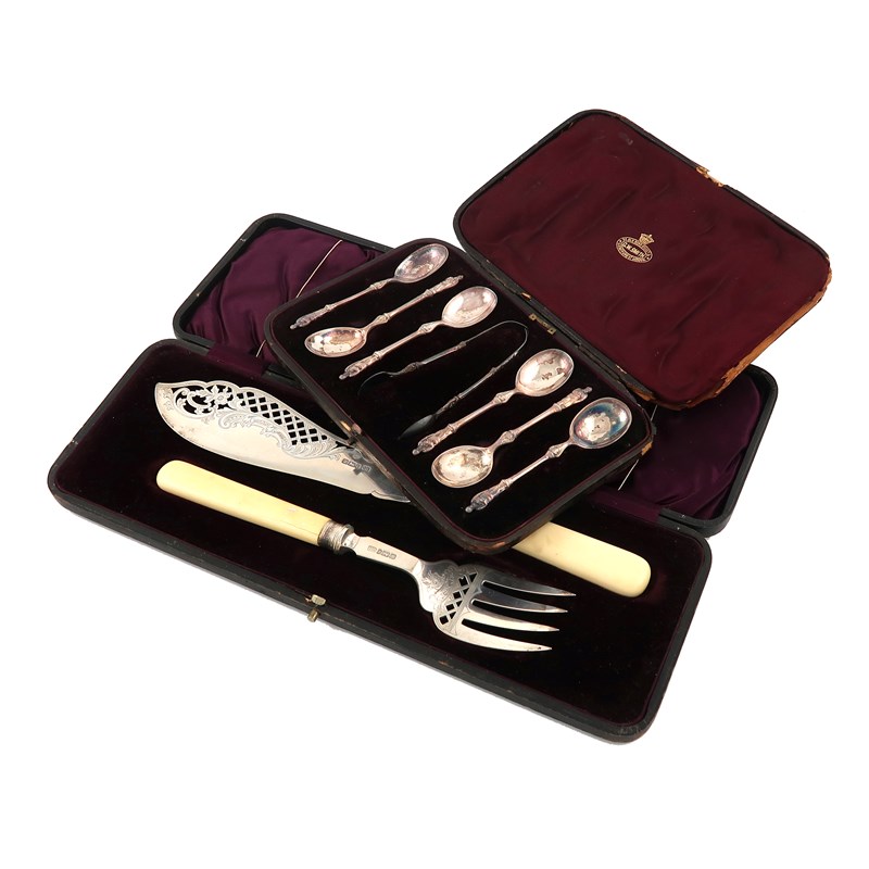 the blades with pierced and engraved decoration, ivory handles, in a fitted case, plus a set of six Victorian Apostle teaspoons and tongs, in a fitted case. (2)