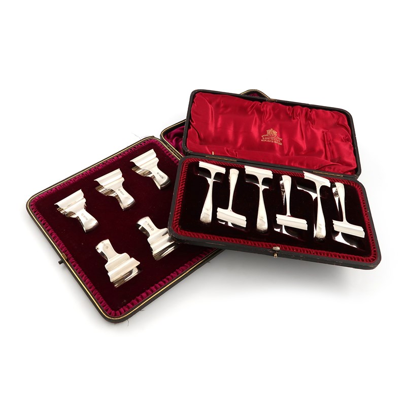plus a set of six plain asparagus holders, by William Hutton and Sons, Sheffield 1913, both in fitted cases, approx. weight 9.4oz. (2)