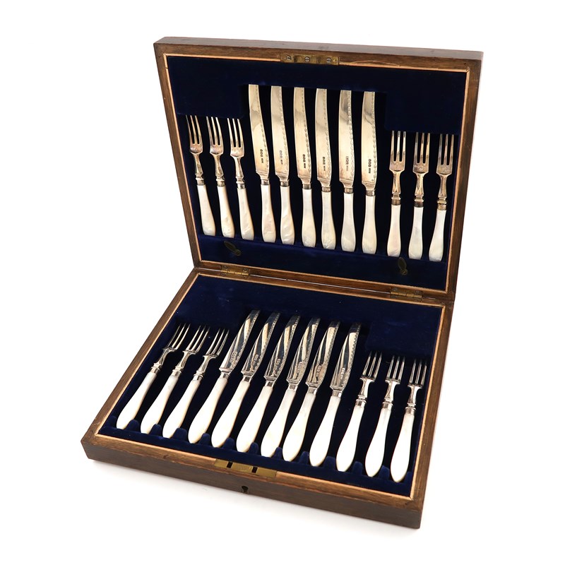 A set of twelve silver and mother-of-pearl fruit eaters,