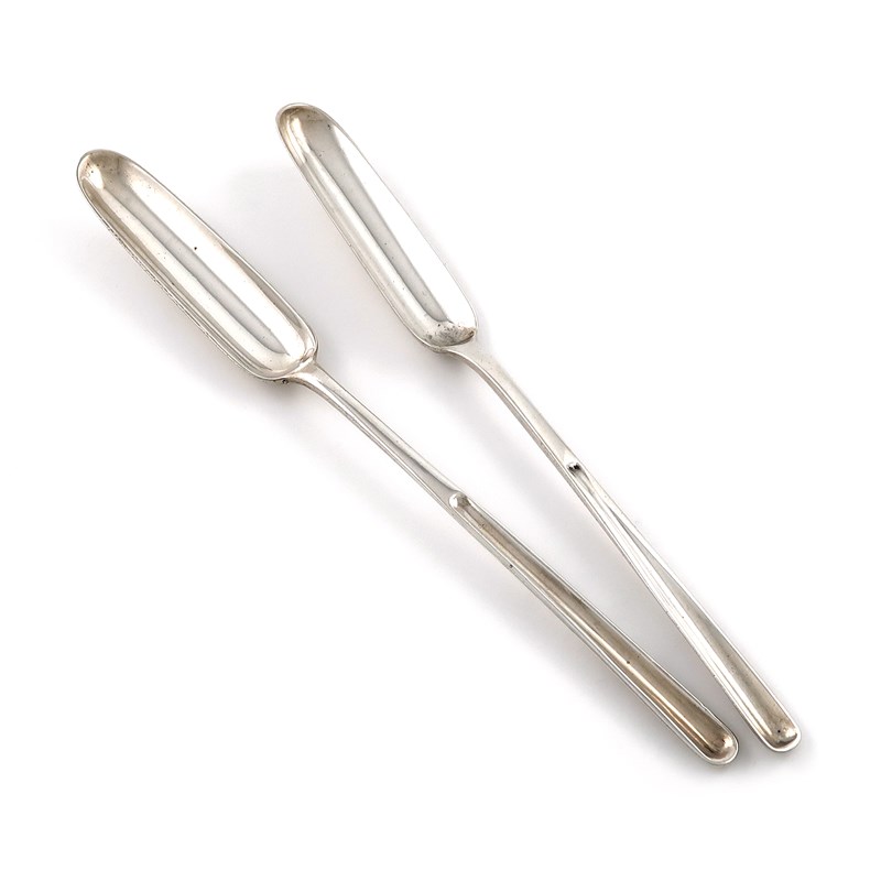 conventional form, length 21.3cm, plus another George III silver marrow scoop, by Richard Crossley, London 1793, the reverse of the bowl with initials, length 22.8cm, approx. total weight 2.9oz. (2)