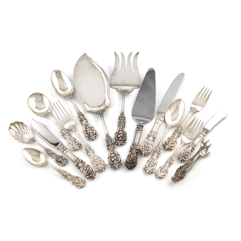 comprising: twelve table forks, twelve table knives, twelve dessert spoons, twelve fish forks, twelve fish knives, (stainless blades), twelve salad forks, twelve soup spoons, twenty-four teaspoons, a pair of fish servers, twelve butter knives, (stainless blades), two tablespoons, a serving slice, a sugar spoon and a pair of sugar tongs, approx. weighable 166oz. (qty)