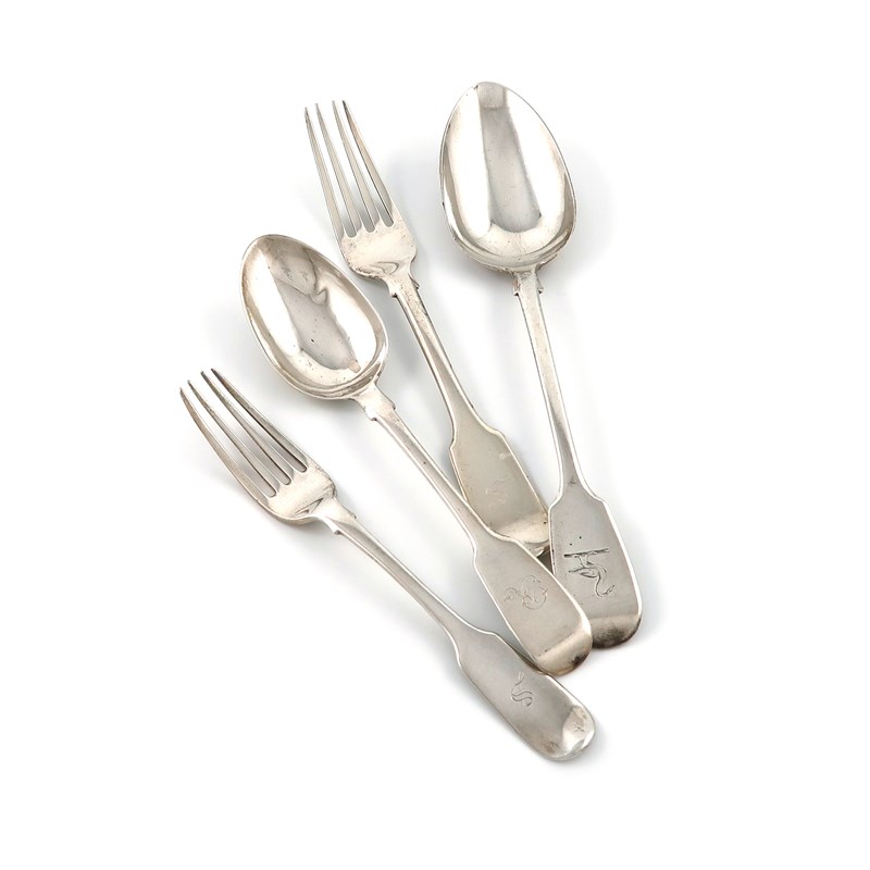 the terminals with crests and initials, comprising: twenty-one table forks, six dessert forks, eleven dessert spoons, and eleven tablespoons, plus one electroplated tablespoon and four electroplated dessert forks, approx. weighable 107oz. (qty)