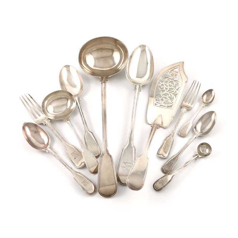 some pieces crested, comprising: a soup ladle, a fish slice, a basting spoon, a pair of sauce ladles, a single sauce ladle, (London 1812), four table spoons, seven dessert forks, seven dessert spoons, five table forks, a condiment ladle, eleven teaspoons, and four egg spoons, approx. weight 92oz. (qty)