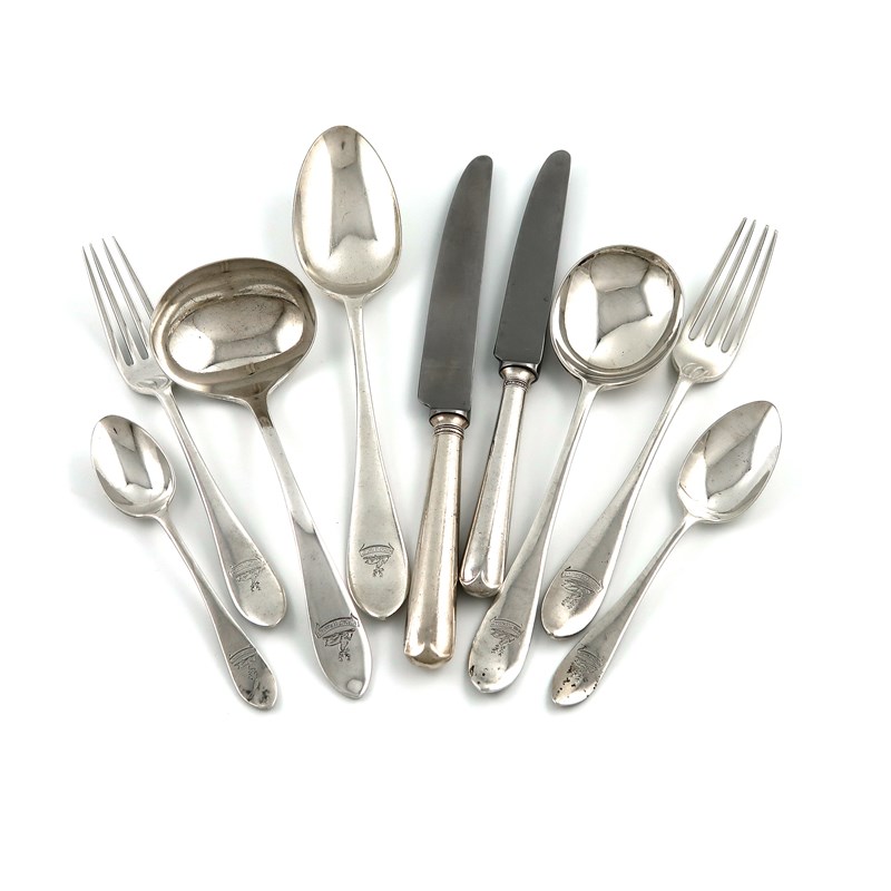the terminals with a crest, comprising: twelve table forks, twelve dessert forks, twelve dessert spoons, twelve tablespoons, twelve soup spoons, eight larger teaspoons, nine smaller teaspoons, a pair of sauce ladles, plus seven modern Old English table knives and eight dessert knives, approx. weighable 133oz. (qty)
