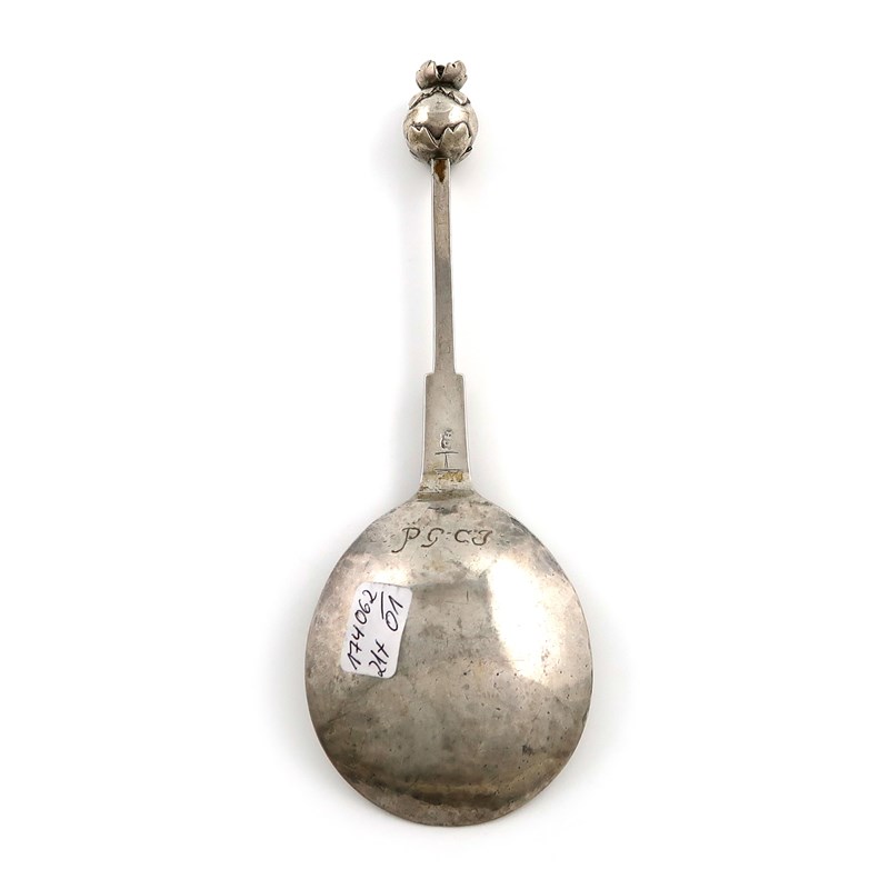 fig-shaped bowl, the reverse initialled 'PG' 'C.J'. faceted and tapering stem, scroll capped ball finial, length 16cm, approx. weight 1.6oz.