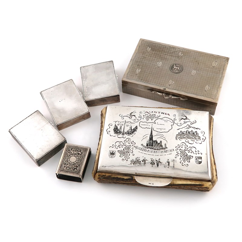 comprising: an Austrian silver and stag horn box, of rectangular form, horn sides, the hinged cover with enamelled scenes of Austria and with 'Austria' in red enamel, an Italian cigarette box, engine-turned decoration, and with a central horse plaque, plus three rectangular boxes, hinged covers, marked with an 'M', and an Indian matchbox cover, approx. weighable 13oz. (6)