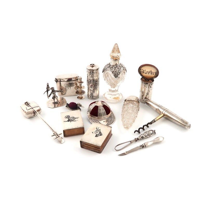 comprising: a travelling corkscrew, by John Harris, London 1863, a modern pin cushion modelled as a jockey's cap, a vesta case, a Japanese novelty pepper pot, a Dutch miniature toy modelled as a standing man holding a bird, two silver-mounted glass scent bottles, a cylindrical container with a cotton reel, two Italian matchbox covers, a modern duck pin cushion, and three other items. (qty)